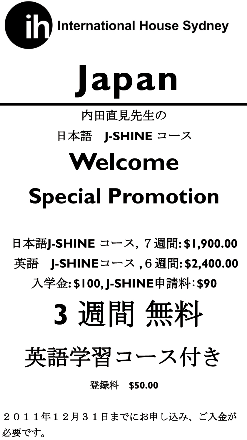この度、インターナショナル・ハウス(IH)・シドニーに新しく日本語のJ-SHINEコースがオープンすることになりました。