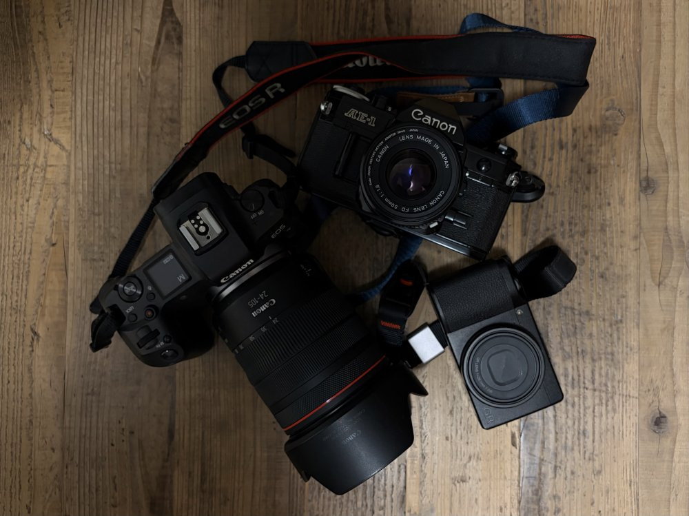 一番大きいカメラがCanon EOS R、中くらいのカメラがCanon AE-1フィルムカメラ、一番小さいものがRICOH GRTAFEでの授業が開始!