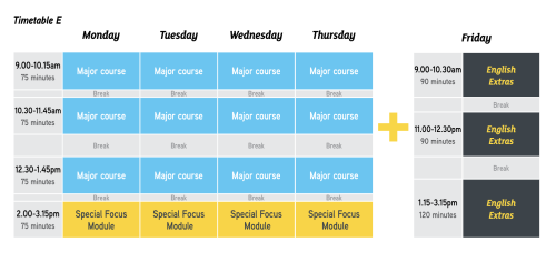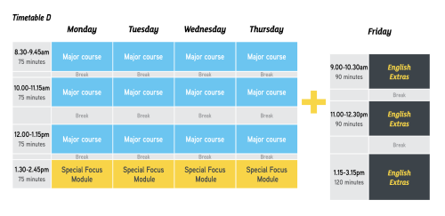 1日5時間、週25時間、先生からの授業が行われます。(金曜日のEnglish Extraはオプション授業です。)