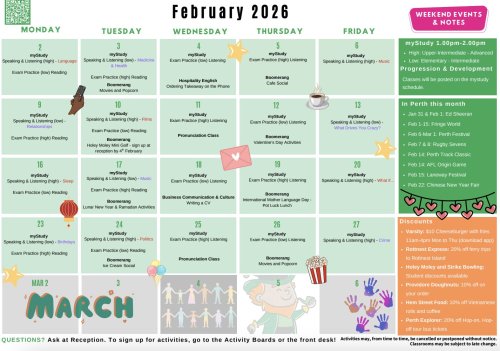 ナビタス・パース校では、一般英語コース以外にも、ケンブリッジ英検対策コース、IELTSコースなどの英語資格取得を目指すコース、または政府が運営をする西オーストラリア州立専門学校(TAFE)、提携校に指定されているカーティン大学に進学するためのアカデミック英語コースの開講も行っています。