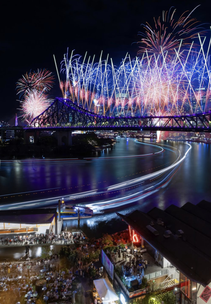 ブリスベンリバーと花火の写真。フォトショップ使用